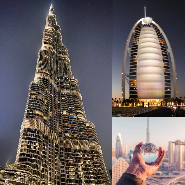 Burj Al Arab: A luxury hotel often referred to as the world’s only “7-star” hotel, known for its distinctive sail-shaped silhouette.